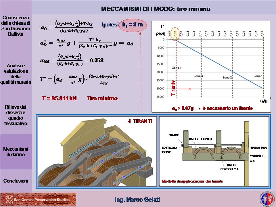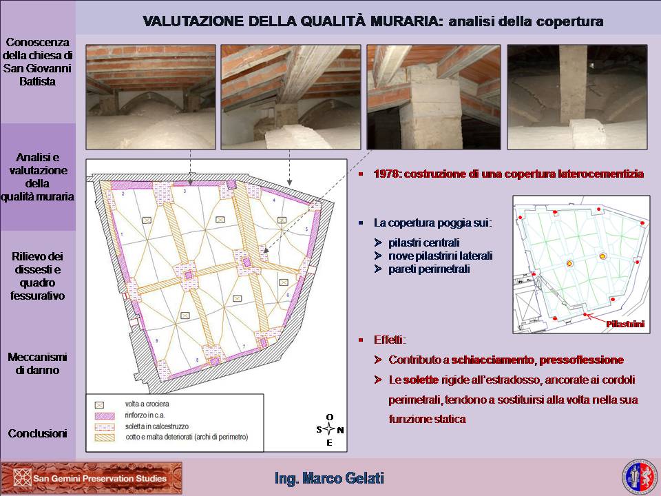Rilievo ed analisi strutturale della chiesa di San Giovanni Battista (San Gemini). La chiesa presenta criticità statiche coerentemente con le porzioni maggiormente danneggiate da una serie di sismi storici documentati. La copertura laterocementizia costruita nel 1978 è responsabile dello schiacciamento delle pareti perimetrali. La differente elasticità della copertura, l'assenza di ammorsamenti tra i vari paramenti murari, la bassa qualità muraria di ciascuno di questi, rappresentano alcuni tra i numerosi fattori di rischio che rendono la chiesa vulnerabile all'azione sismica. La ricostruzione dei sismi storici indica inoltre che è dal 1751-1753 che non si registra un sisma distruttivo. Sono quindi necessari interventi di varia tipologia: dalle iniezioni di malta a bassisima pressione per ridare «corpo» alle pareti perimetrali, all'applicazione di funi metalliche che agiscano da tiranti per impedire il ribaltamento di paramenti tra i quali la facciata più recente. Segue una breve sintesi dello studio svolto.